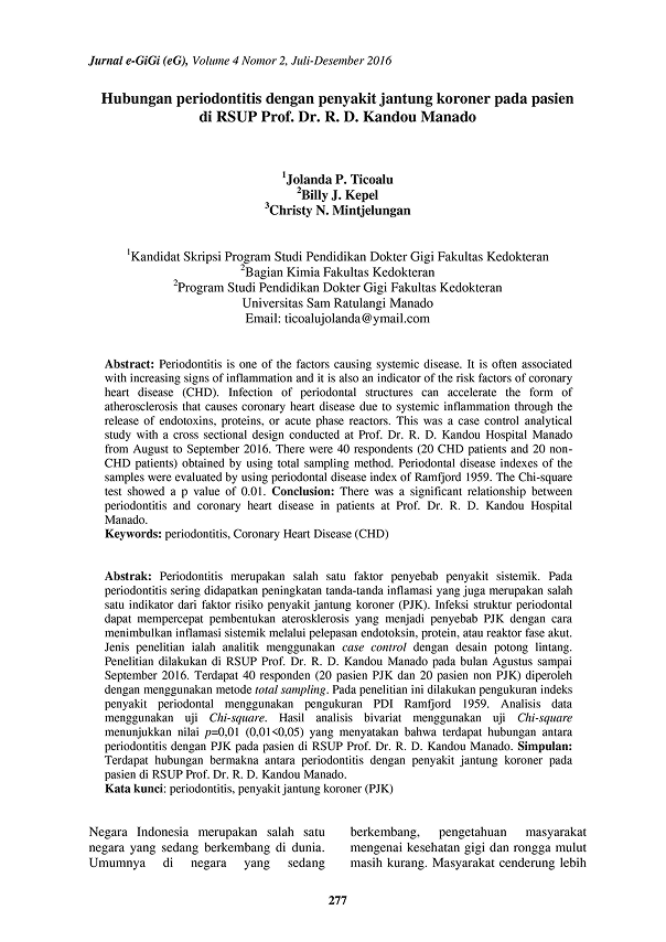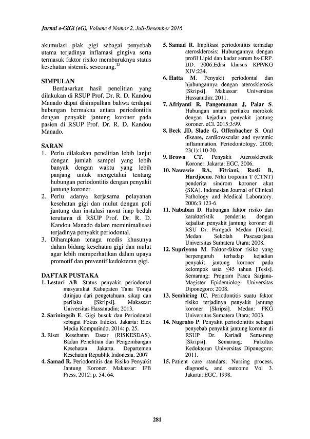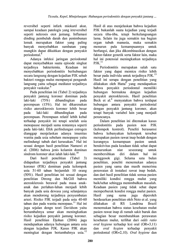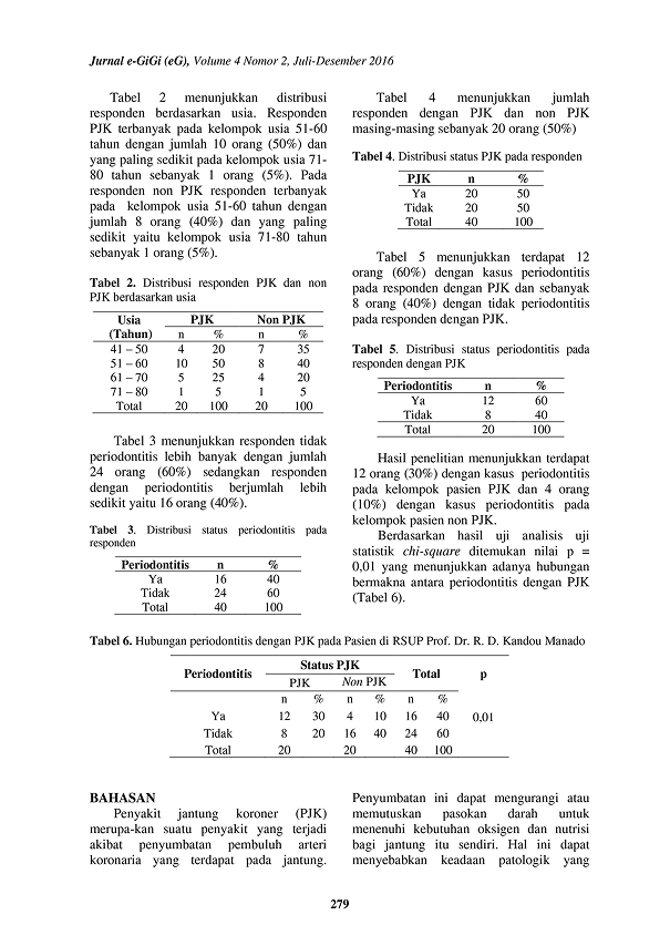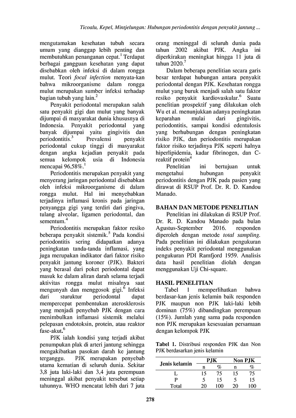 Bakteri yang berasal dari periodontal dapat masuk ke dalam aliran darah selama terjadi aktivitas rongga mulut misalnya saat mengunyah dan menggosok gigi. Infeksi dari sturuktur periodontal dapat mempercepat pembentukan aterosklerosis yang menjadi penyebab Penyakit Jantung Koroner (PJK).